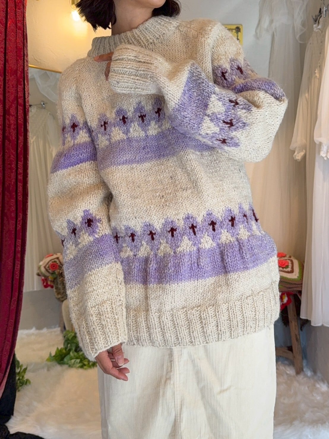 ハンドニットのため編み目が不揃いだったり糸処理が見えている箇所がございます。